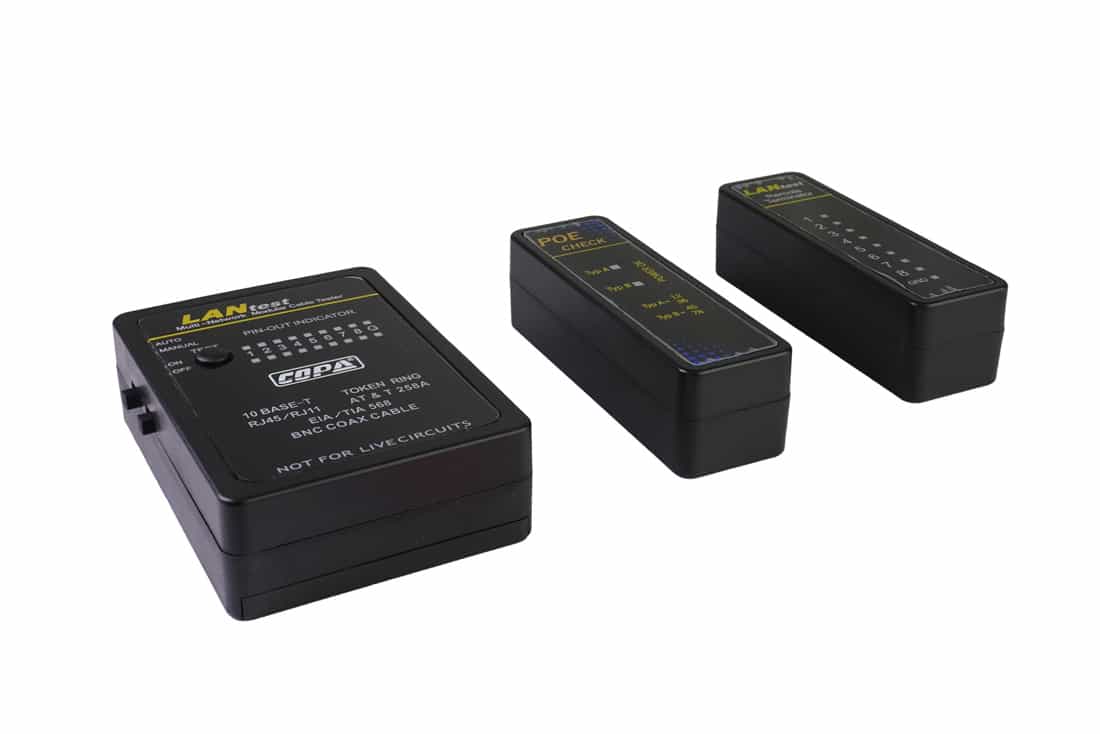 ערכת מכשירי בדיקה (3 חלקים) בודק כבלי רשת BNCRJ11RJ45, והאם קיים PoE+PoE, מגיע במארז פלסטיק קשיח סגור, כולל מופא BNC, כבל גישור UTP באורך 15 ס"מ, 2 מתאמים מ-רשת זכר ל BNC זכר, מתאם פלסטיק מ RJ45 ל RJ11. מקבל סוללת 9V (לא כלולה במארז), תומך תקן IEEE 802.3af/a.