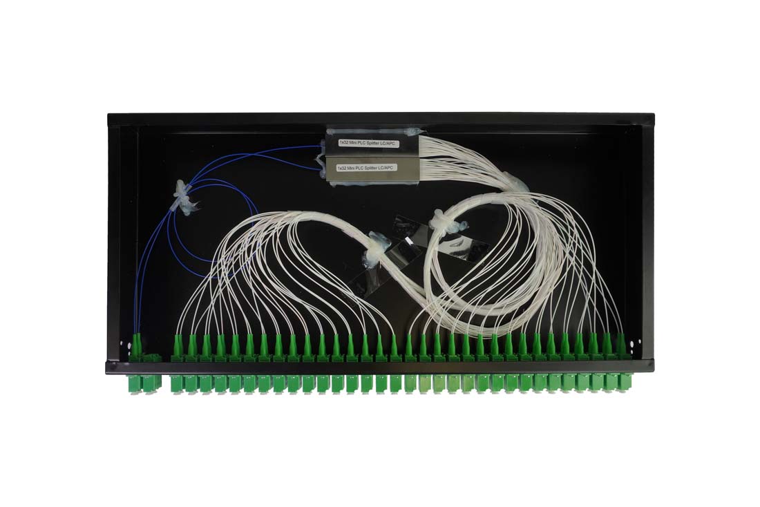 פנל ומפצל אופטי 1U המיועד לרשתות פסיביות PON כולל מתאמים ומפצל SM APC, מורכב מ 2 יחידות PLC 1X32.
